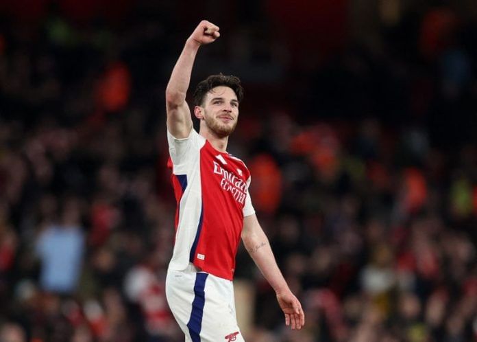 LONDON (Reuters) – Arsenal remain comfortably adrift of relentless Premier League leaders Liverpool despite a 5-1 hammering of Manchester City on Sunday but midfielder Declan Rice says there is a determination to hunt them down.