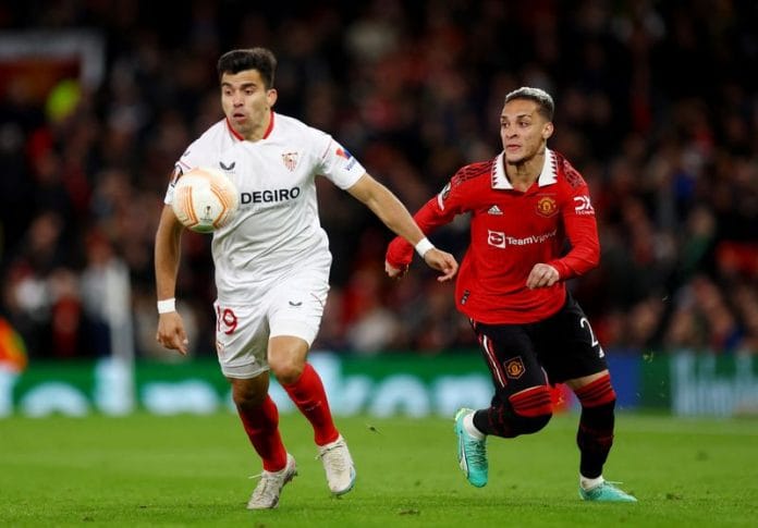 Marcel Sabitzer’s quickfire double in the first half put Erik ten Hag’s team in control of the tie, but Sevilla, record six-times Europa League champions, pulled one back in the 84th minute when Jesus Navas’s shot pinged off the feet of Tyrell Malacia and keeper David de Gea into the net.