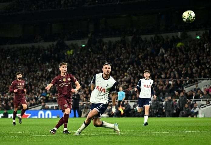 LONDON (Reuters) – Tottenham Hotspur beat Manchester City 2-1 with goals from Timo Werner and Pape Matar Sarr, while interim Manchester United boss Ruud van Nistlerooy saw his side thump Leicester City 5-2 on Wednesday, putting both sides into the League Cup quarter-finals.