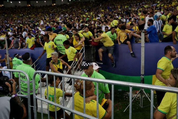The Argentina team, led by captain Lionel Messi, went over to the terraces to try and calm the situation before leaving the pitch and returning to the dressing room.
