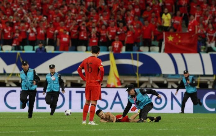 XIAMEN, China (Reuters) -A spectator with patriotic slogans written in Chinese on his t-shirt and body ran onto the field and briefly disrupted the China-Japan soccer World Cup qualifier in China’s eastern city Xiamen on Tuesday.