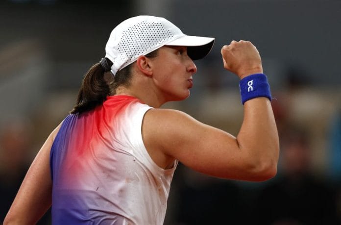 PARIS (Reuters) -Iga Swiatek kept her cool to breeze into the French Open fourth round on another damp day at Roland Garros on Friday but the red mist descended on Andrey Rublev who raged and ranted before becoming the highest men’s seed to crash out.