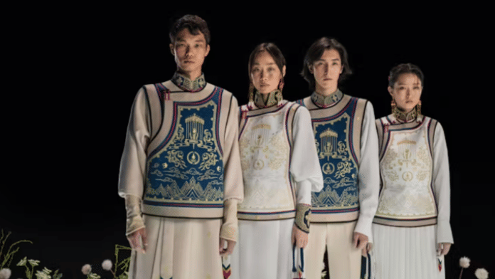 All four looks showcase embroidered vests, with the men sporting blue and the women white. The vest, front and centre, announces “Go Mongolia Team”.