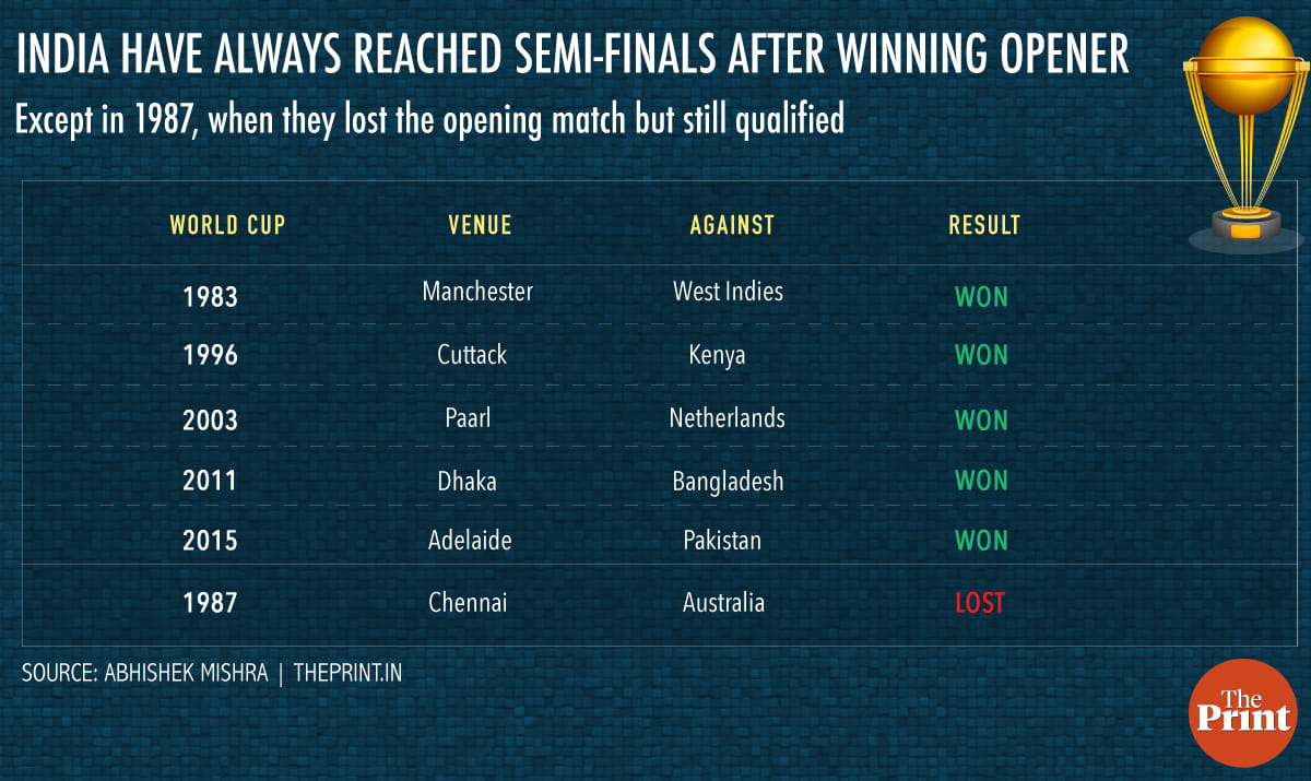Every time India have won their opening match at a World Cup, they have at least reached the semi-finals. The only exception to this rule was 1987, when Kapil Dev’s defending champions lost their opening match, and yet made it to the knockout stage.