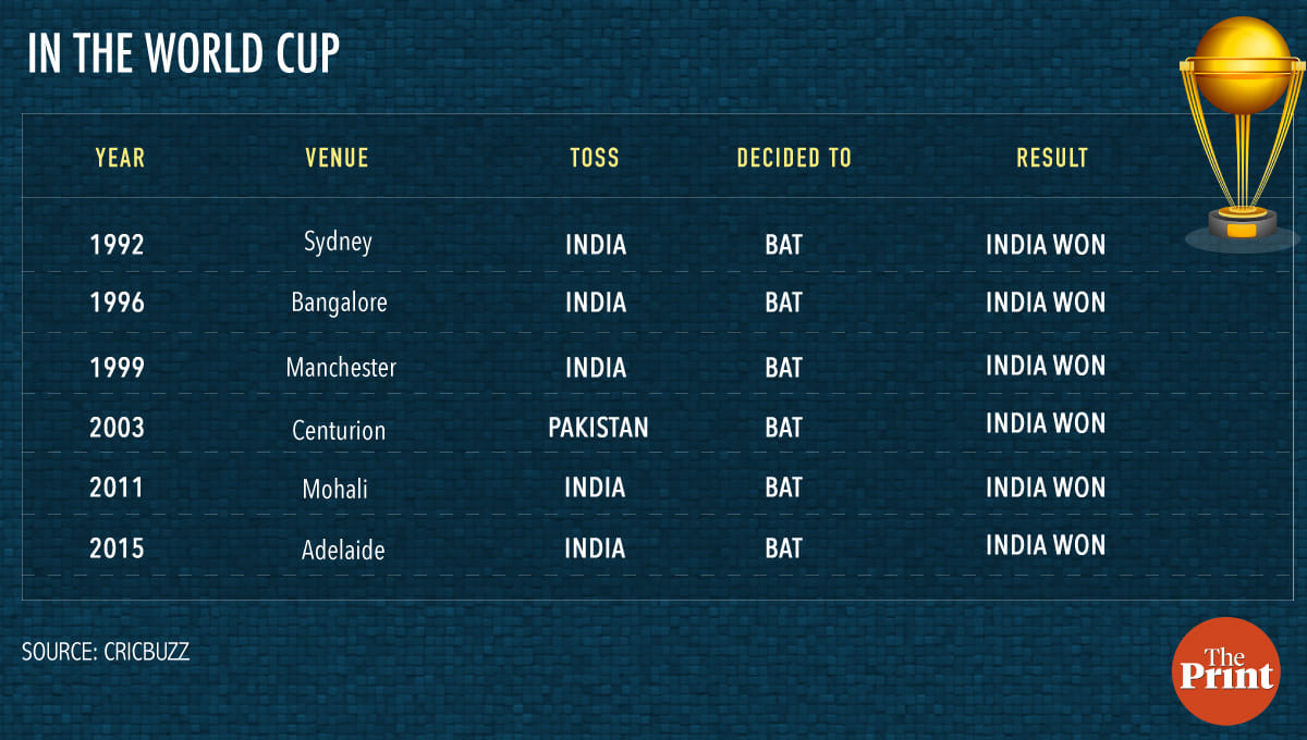 It’s advantage India with the toss too. India has won the toss five out of six times in World Cup matches between the two teams. On each occasion, India elected to bat first and then went on to win.