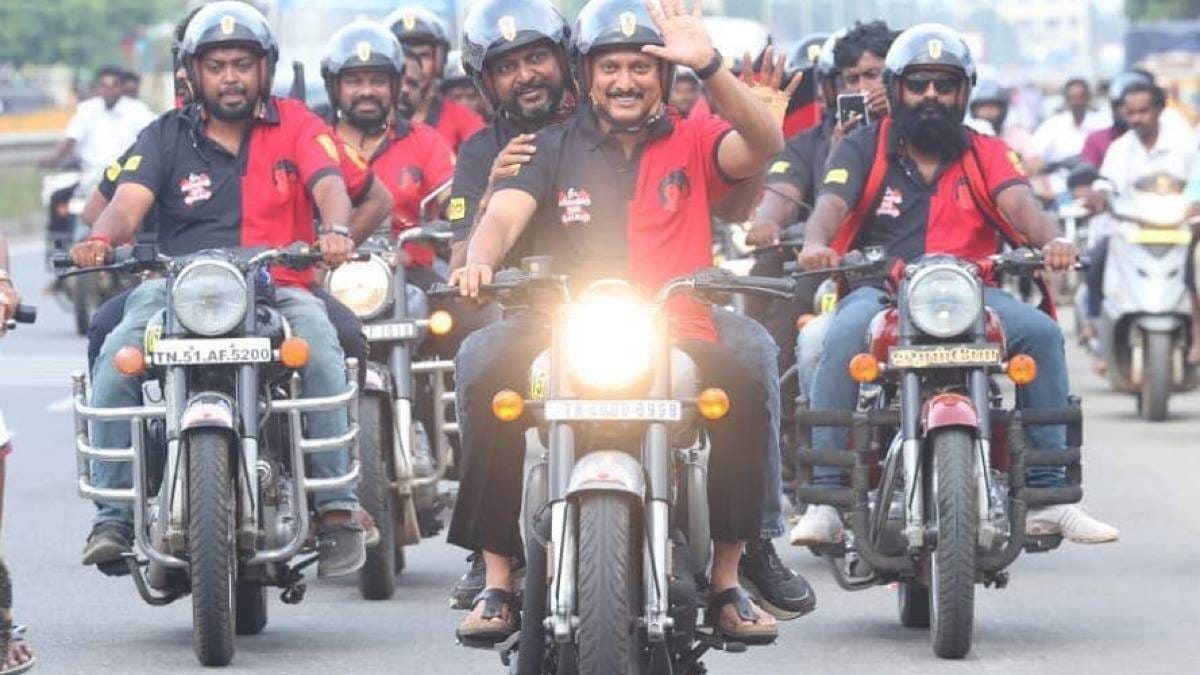 The DMK riders’ bikes, a Royal Enfield Bullet with a 350cc engine, hold the DMK flag with the image of a rising sun. “The 350cc was chosen because it is a reliable bike and also for its tagline — made like a gun, goes like a bullet,” said Tamilmaran.