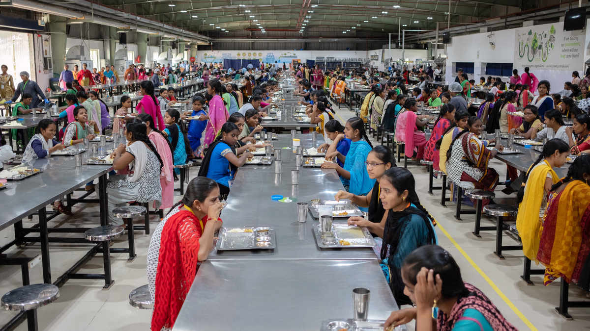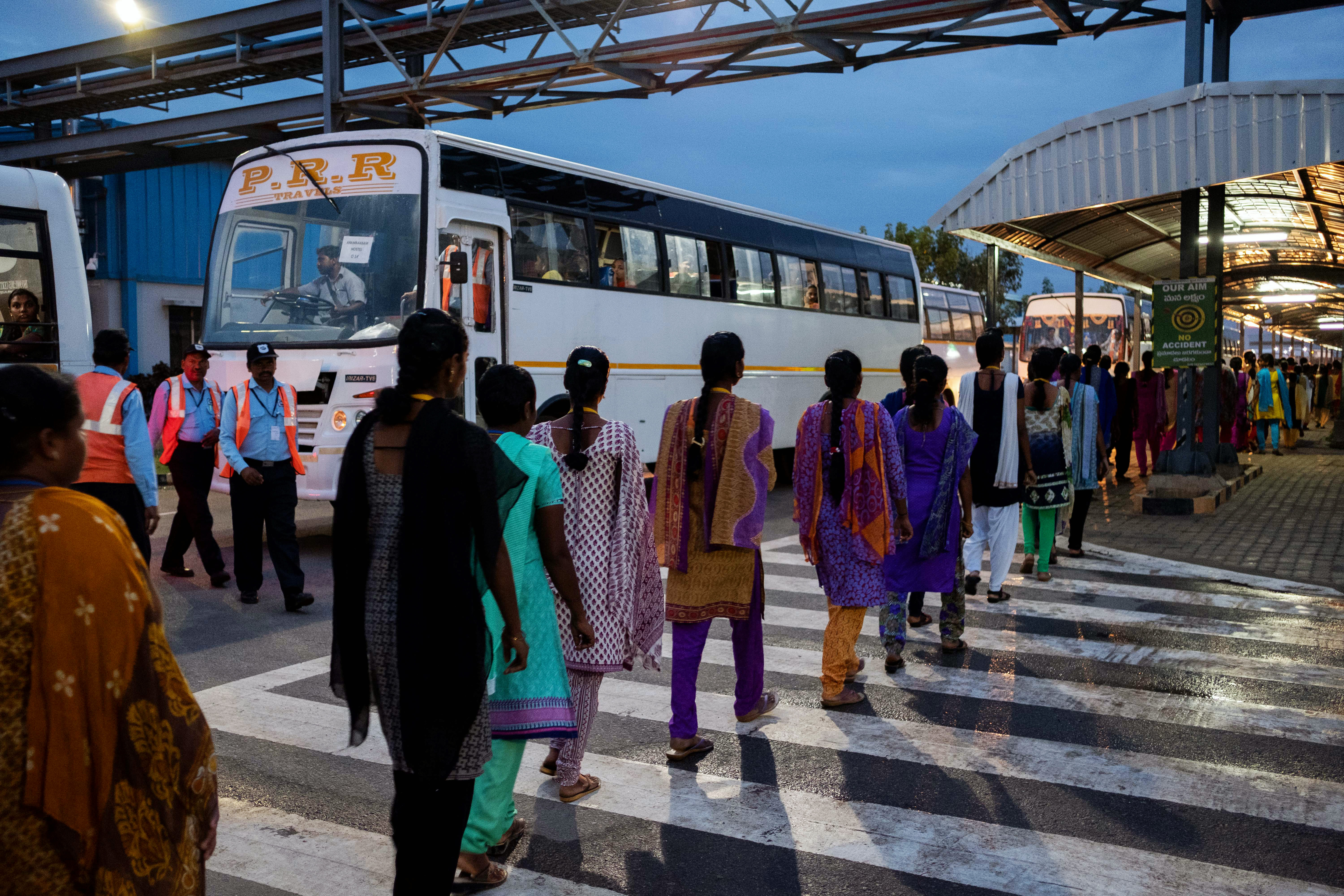 On a steamy summer morning, dozens of buses pull up outside a cluster of low-slung, blue buildings in the south Indian state of Andhra Pradesh. Women dressed in colorful salwar kameezes disembark, their dupatta body scarves billowing as they make their way past hibiscus bushes and posters proclaiming, “Our aim, no accident.”