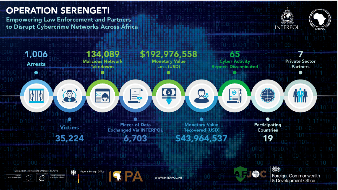 In November 2024, for example, INTERPOL announced that an operation dubbed Operation Serengeti led to the arrests of more than 1,000 suspected cybercriminals responsible for 35,000 victims in 19 countries across all regions of Africa.