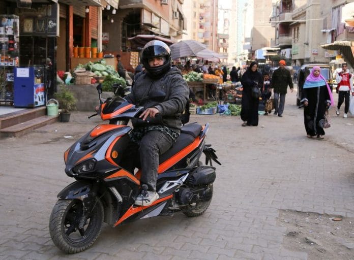 GIZA, Egypt (Reuters) – Eman Al-Adawi traverses Giza speed bumps and puddles on her scooter, one of the few women on two wheels on Egyptian streets and highways.