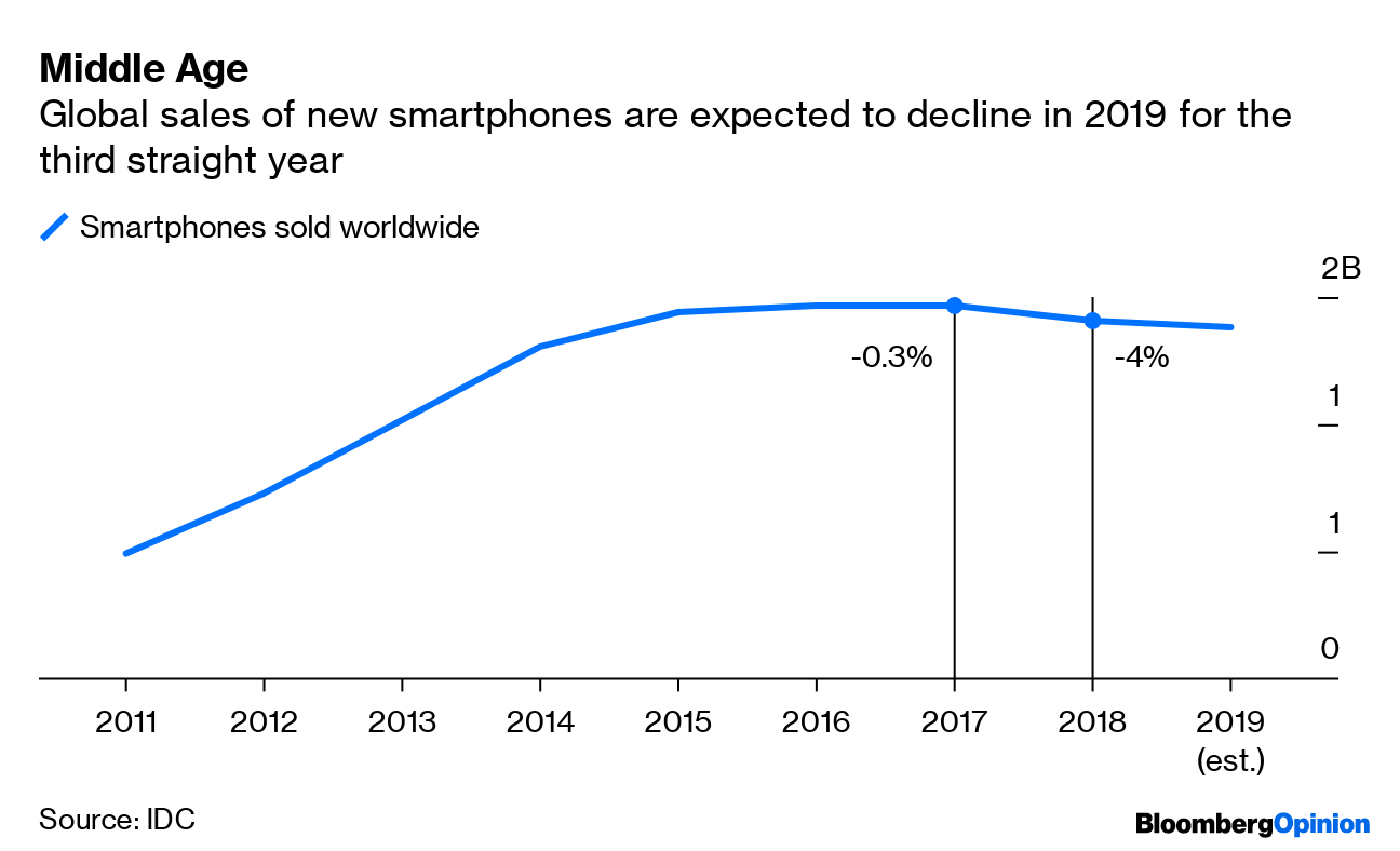 New smartphone sales are on track to decline in 2019 for the third consecutive year, according to researcher IDC. In the biggest smartphone markets, such as China, the U.S. and Europe, a large share of people already own smartphones, and they’re typically waiting longer to replace them — on average more than three years between purchases in the U.S., according to telecom industry consultant Chetan Sharma.