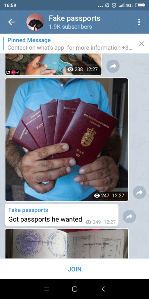 A public channel called ‘Fake passports’ with 1,900 subscribers promised fake passports for a price: A UK passport for $2,499, and US and French passports for $1,999 and $2,199.