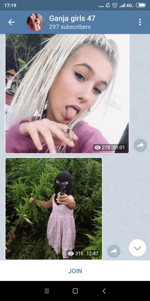 Another public Telegram channel called ‘Ganja girls 47’ showed largely non-Indian girls in seductive poses with some form of marijuana (ganja). One photo seemed to depict a child wearing a ski mask pointing a gun against a field of marijuana.