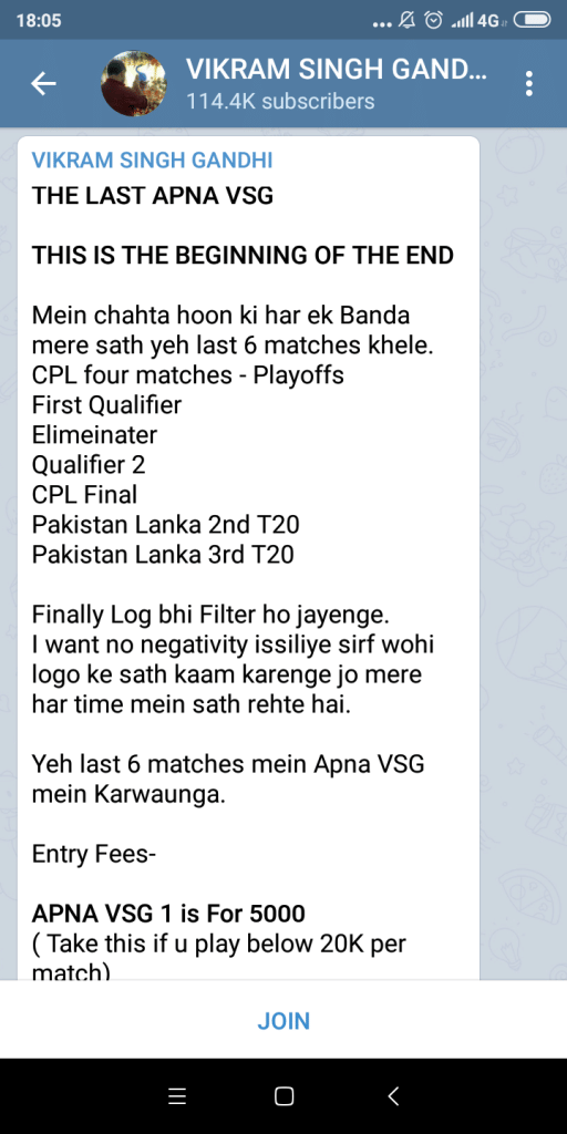 Cricket betting, which is illegal in India but legal in countries like the UK, also thrives on Telegram. A channel named ‘Vikram Singh Gandhi’ with over 1 lakh subscribers was seen here inviting users to bet on cricket matches.