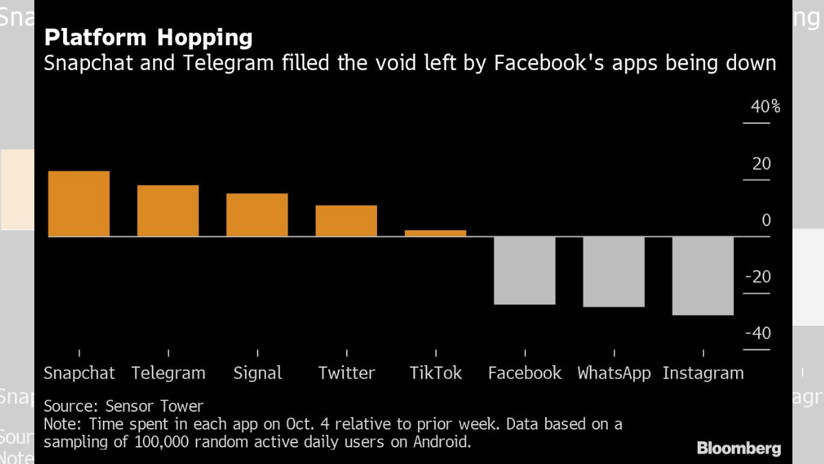 Facebook blamed network configuration glitches for immobilizing a suite of apps from Messenger to Instagram and driving some of its 2.7 billion daily users to the competition. Snap Inc. saw a 23% boost in time spent on its Android app on Monday compared with the same day the prior week, according to Sensor Tower data shared with Bloomberg News. That led gains in activity on apps from Telegram and Signal to Twitter Inc. and ByteDance Ltd.’s TikTok on Oct. 4, the mobile researcher said.