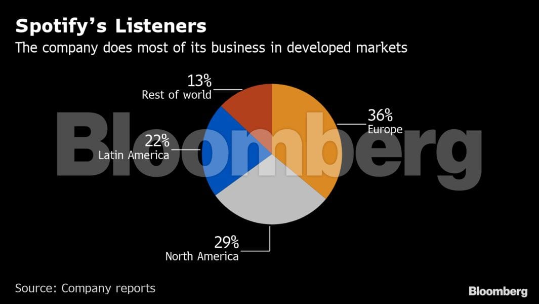 Spotify has asked investors to trust that the market for audio streaming is still in its early stages. The company counts on North America and Europe for 65% of its users. Africa, Asia, and the Middle East make up just 13%.