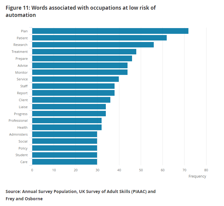 “Words relating to management, planning and advisory skills are seen to be the most prevalent in tasks involved in low-risk occupations,” the ONS wrote. “Health-related words such as patient and treatment also appear frequently. These words reflect working with people and represent the value added by humans in these roles, which is difficult to computerise.”