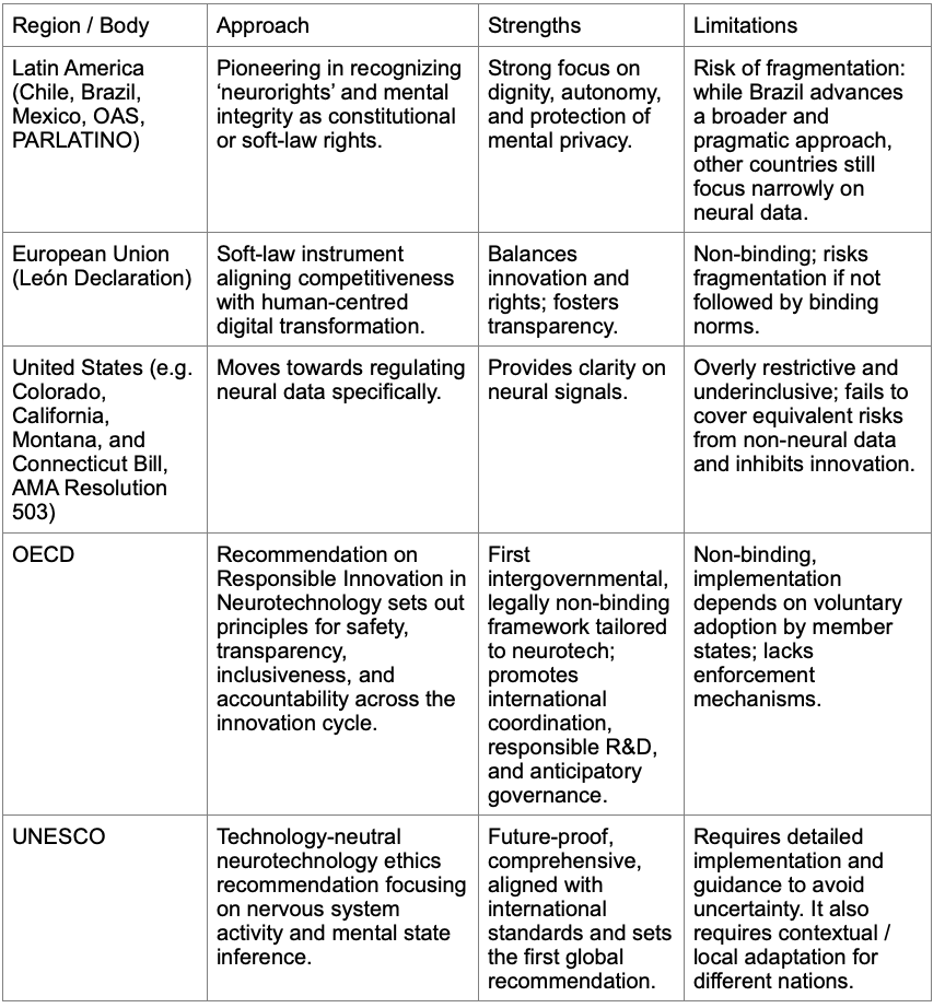 Different regions and institutions are experimenting with distinct approaches towards neurotechnology regulations. Comparing them helps us identify strengths and pitfalls.