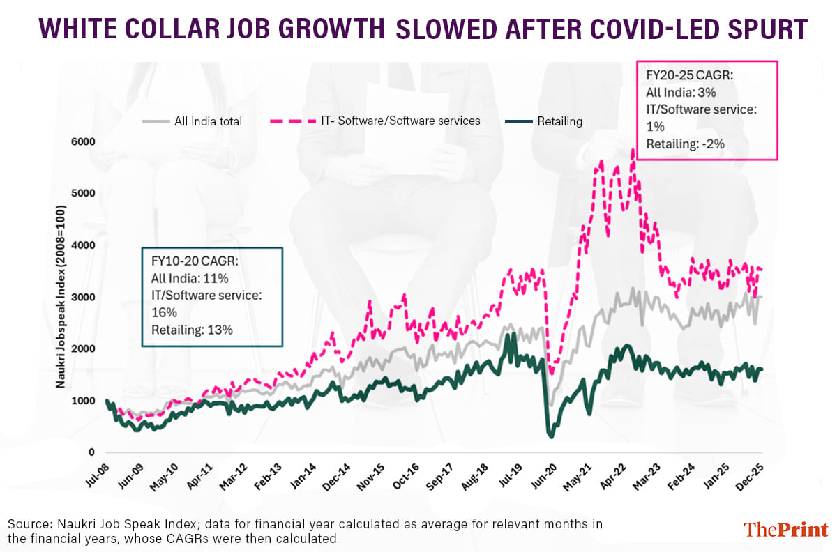 According to Naukri (India’s largest online classifieds business) JobSpeak index, job growth across all sectors was 11 percent per annum from FY10-20. After the pandemic (FY23-FY25), this rate slowed down to a mere 3 percent per annum.