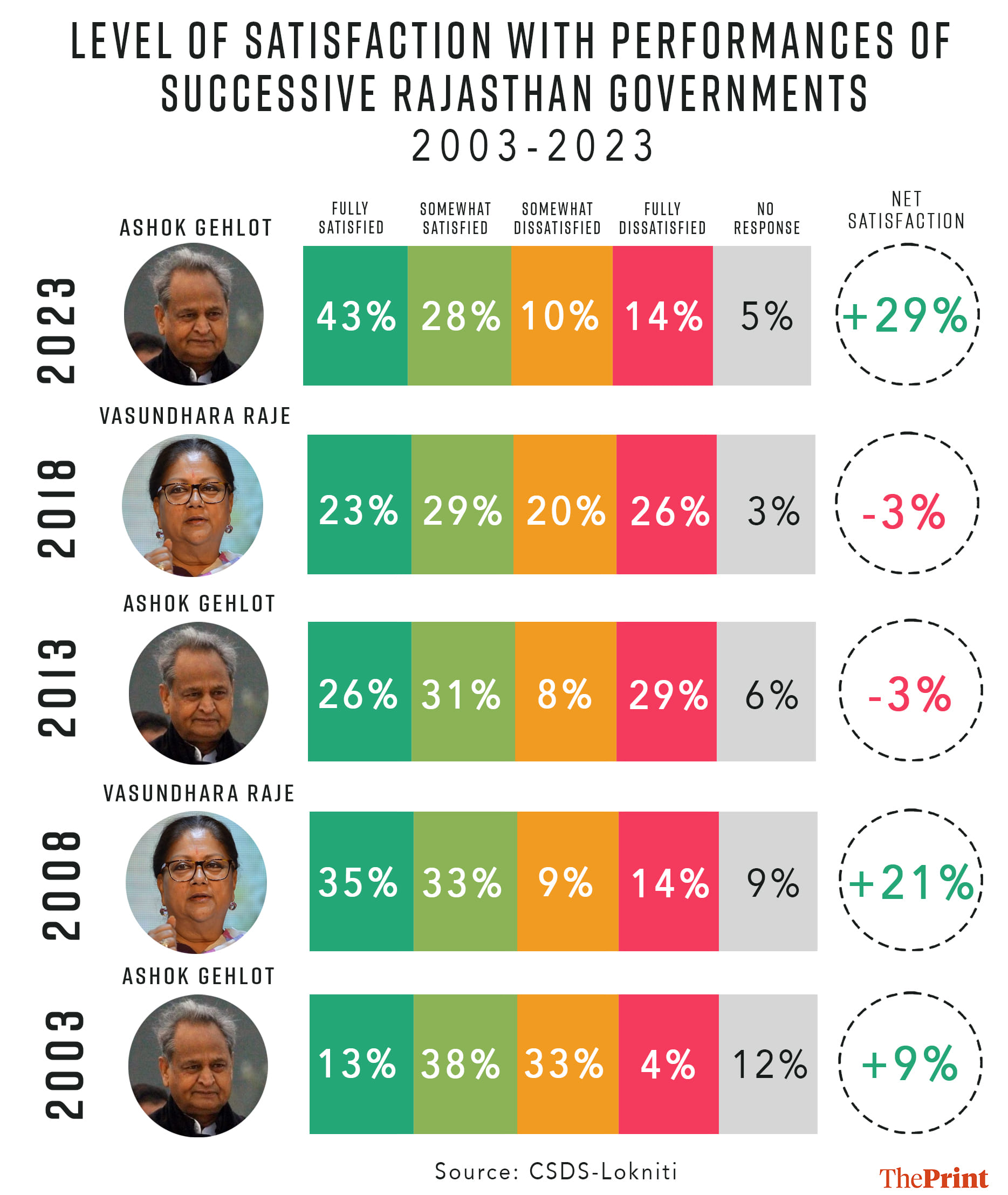 If we go for a more nuanced indicator of ‘net satisfaction’ (difference between those ‘fully satisfied’ and ‘fully dissatisfied’), the contrast is even more glaring: Gehlot government at +29 percentage points (43 per cent fully satisfied minus 14 per cent fully dissatisfied) versus Raje government at -3 points.