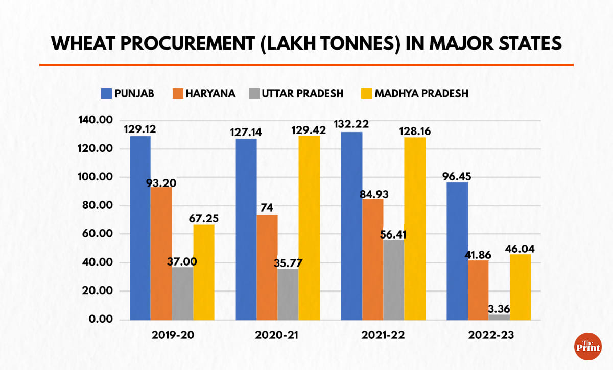 In Haryana, the procurement was 9.3 million tonnes in 2019-20, 7.4 million tonnes in 2020-21 and 8.5 million tonnes in 2021-22. But in 2022-23, it fell to 4.2 million tonnes. Haryana is also not a preferred state for the purchase of wheat by private trade as the market fee and other charges add up to 6.5 per cent.