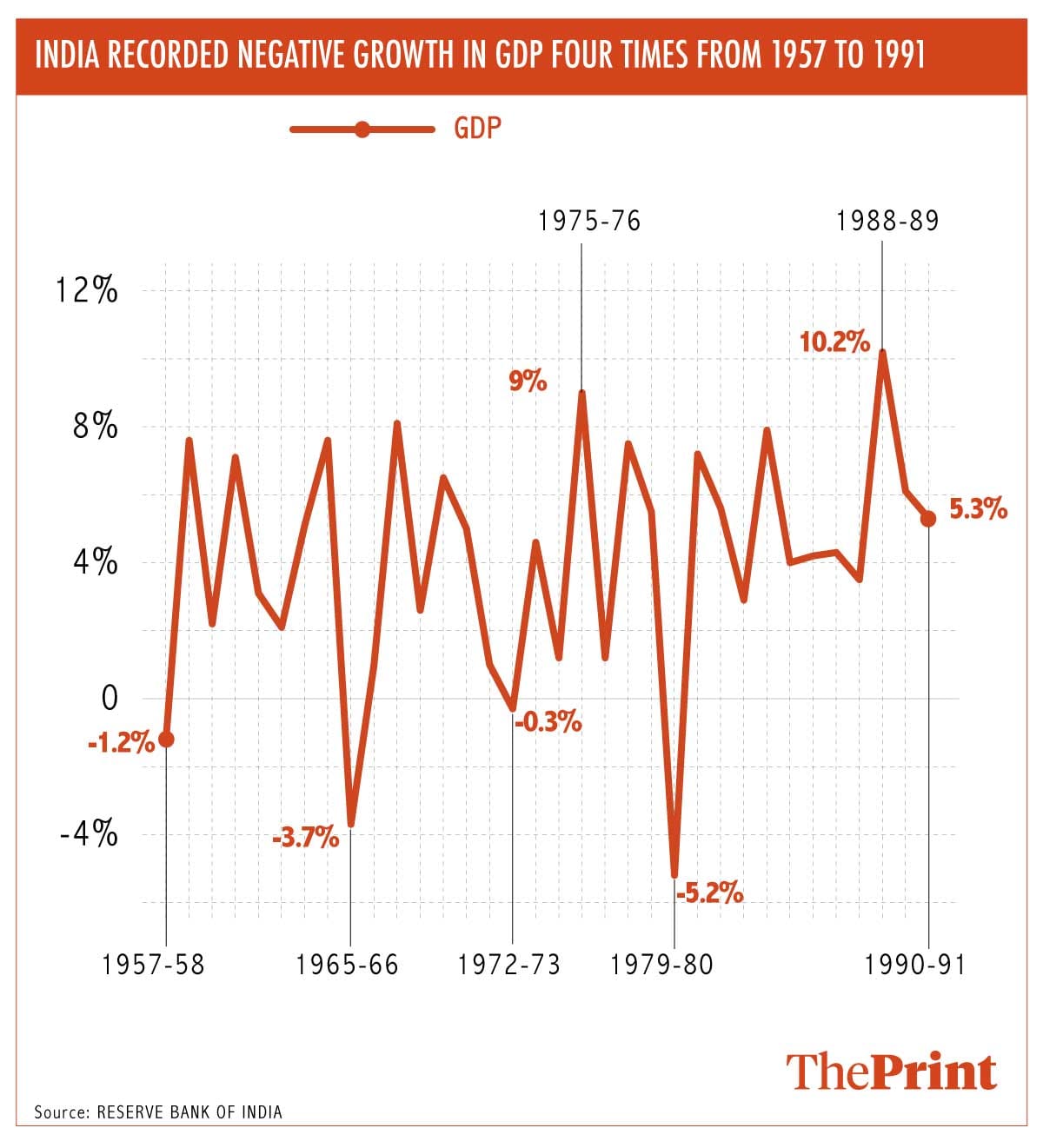 From 1957 up to the pre-liberalisation period, India witnessed four years of an actual fall in output or negative growth in GDP. These were in the years 1957-58, 1965-66, 1972-73 and in 1979-80 when the economy grew at -1.2 per cent, -3.7 per cent, -0.3 per cent and -5.2 per cent, respectively.