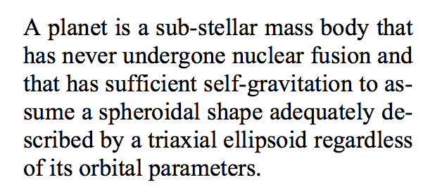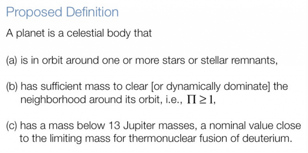 The definition is clean. The first point includes planets orbiting binary stars or remains of a star like a black hole; point (b) follows “cleaning the neighbourhood” but dynamically, ie, in its physical neighbourhood while moving around, not the orbit’s neighbourhood; point (c) excludes brown dwarfs and anything bigger.
