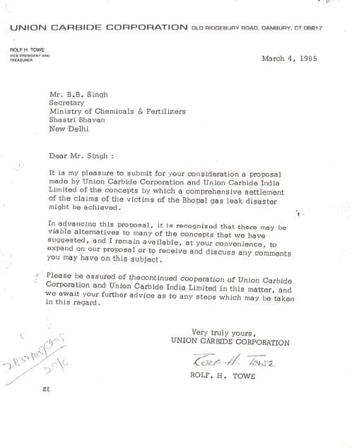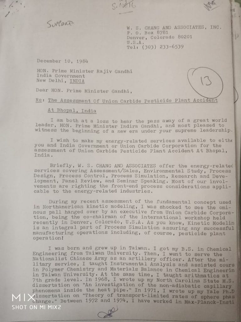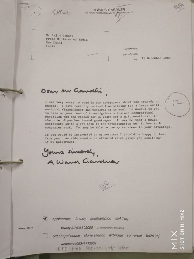 People with “expertise” in dealing with occupational injuries, health hazards, and disaster management also offered their services to Rajiv Gandhi. Two of them (one of them having worked for Exxon) copied their letters of help to Warren Anderson, begging the question that Union Carbide had asked them to do this.
