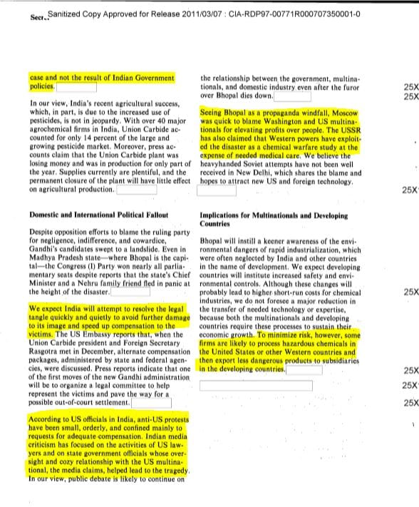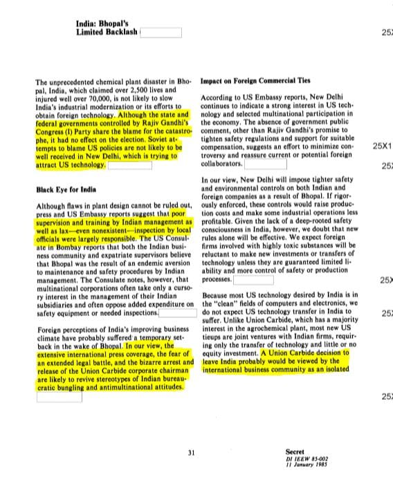 In the years to come, Union Carbide has minced no words in condemning the government of India for not acting appropriately and for rejecting any help that the corporation was offering. The CIA, in a declassified report dated January 1985, also paints the Indian government in bad light, calling them ineffectual.