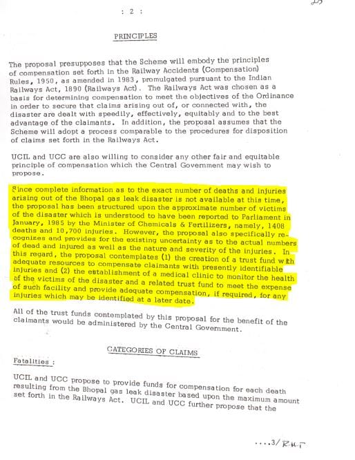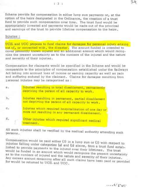 A document marked “Top Secret” shows that Union Carbide was proposing a settlement within three months of the disaster. It shows that the Ministry of Chemicals and Fertilisers had met with Rolf Towe, the vice-president of Union Carbide, and together had drawn up different categories for compensation. Union Carbide offered a payment of Rs 1 lakh for each death, and six years later this was the amount the government paid the Bhopal victims. Another shocking category is that of “temporary injury” — unbelievable because nobody can be temporarily injured because of a lethal gas. 94% of victims with permanent injuries were assigned to this category, and paid the minimum amount of Rs 25,000.