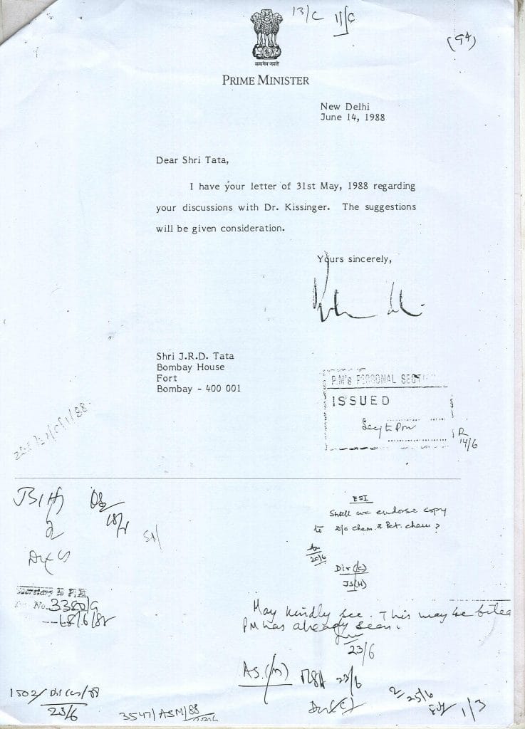 In this letter, dated 31 May 1988, J.R.D. Tata writes to Rajiv Gandhi three-and-a-half years after the tragedy, telling him that Dr Henry Kissinger would urge him to accept Union Carbide’s terms for a settlement.