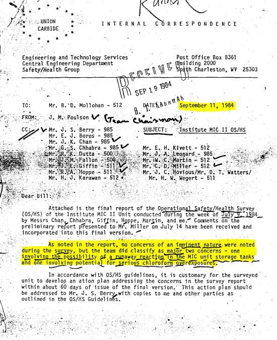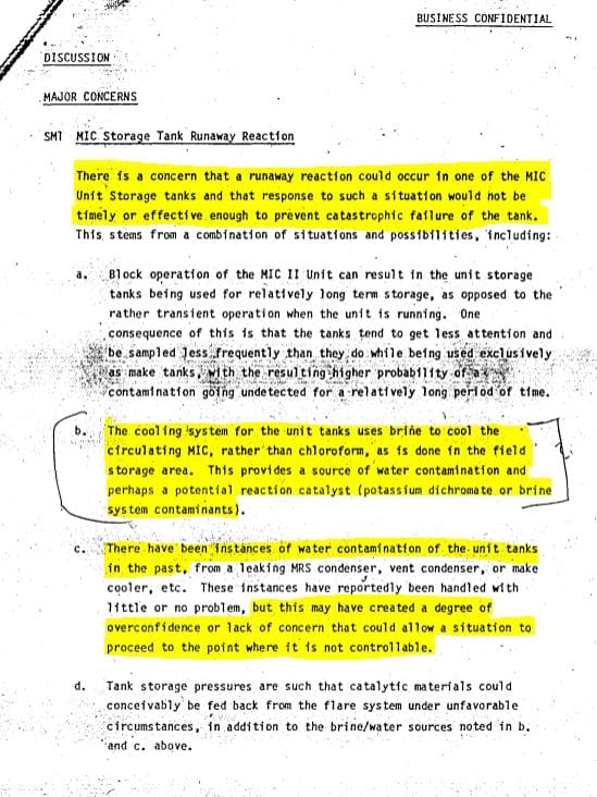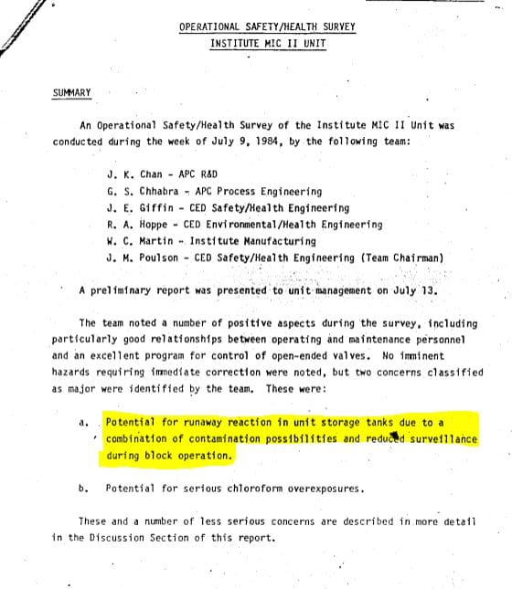 The gas leak is made even more poignant because a safety and health report from September 1984, just a few months before that fateful night, flags the possibility of the leak.
