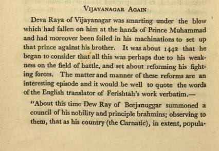 Excerpts from H.K. Sherwani’s ‘The Bahmanis of the Deccan’ quotes Ferishta’s words about how Deva Raya II set about trying to reform his military by learning from his Muslim rivals.