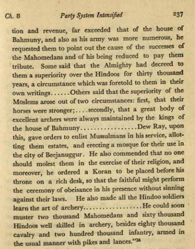 He “gave orders to enlist Mussulmans (Muslims) in his service, allotting them estates, and erecting a mosque for their use in the city of Beejanuggur (Vijayanagara). He also commended that no one should molest them in the exercise of their religion, and moreover, he ordered a Koran to be placed before his throne on a rich desk, so that the faithful might before the ceremony of obeisance in his presence without sinning against their laws.”