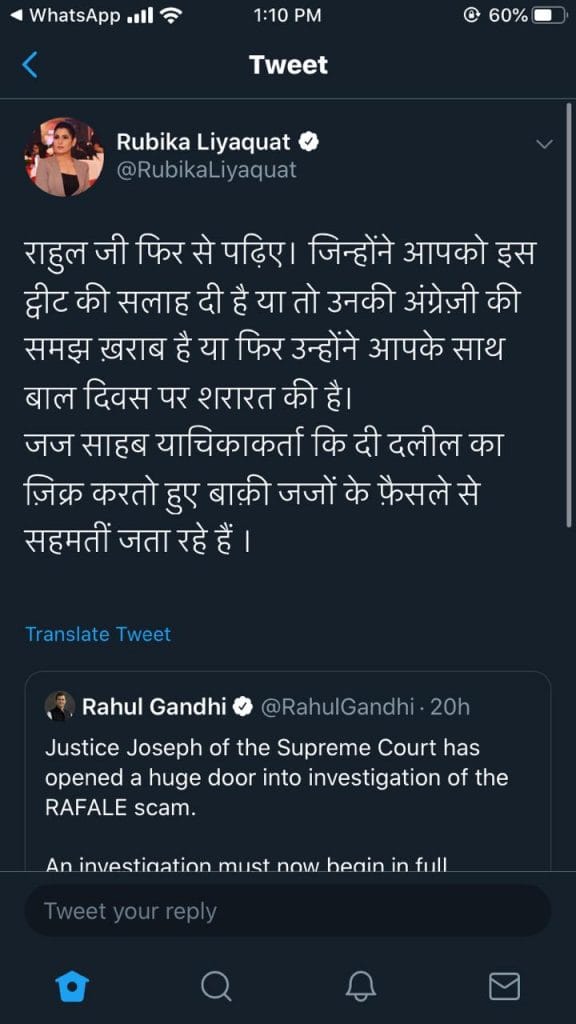 ABP News anchor Rubika Liyaquat calls out Rahul Gandhi’s tweet on Rafale. Then deletes it…