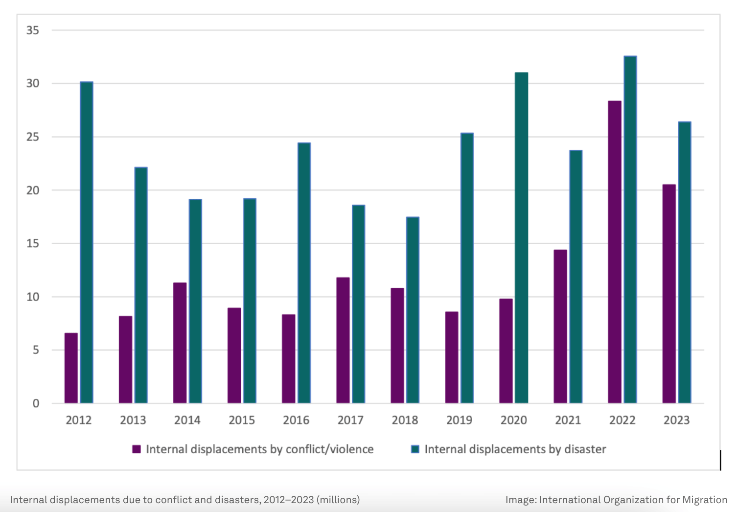When we take a close look at global internal displacement patterns, for example, we can discern some key challenges when it comes to implementing solutions. Year on year, the number of internal displacements (or movements) due to disasters such as wildfires, floods, monsoons and so on far outstrip those displacements caused by conflict and violence.