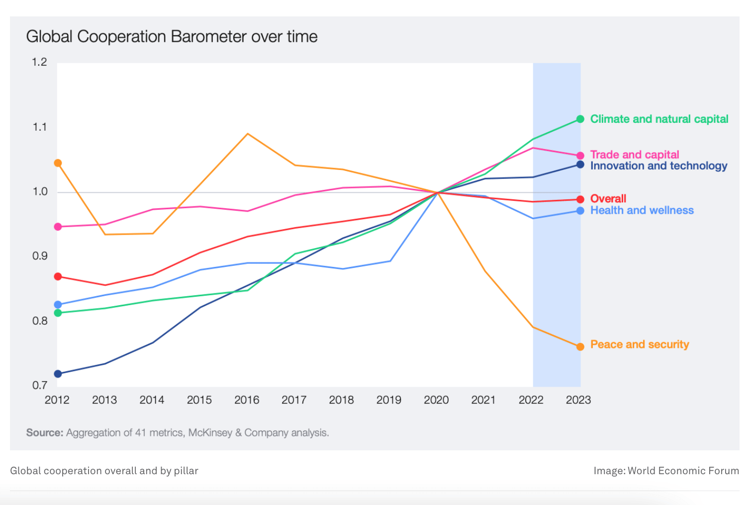 The World Economic Forum’s new Global Cooperation Barometer 2025 insight report, for example, shows that cooperation on peace has dropped significantly over the last few years, contributing to elevated risk of more human displacement this year.