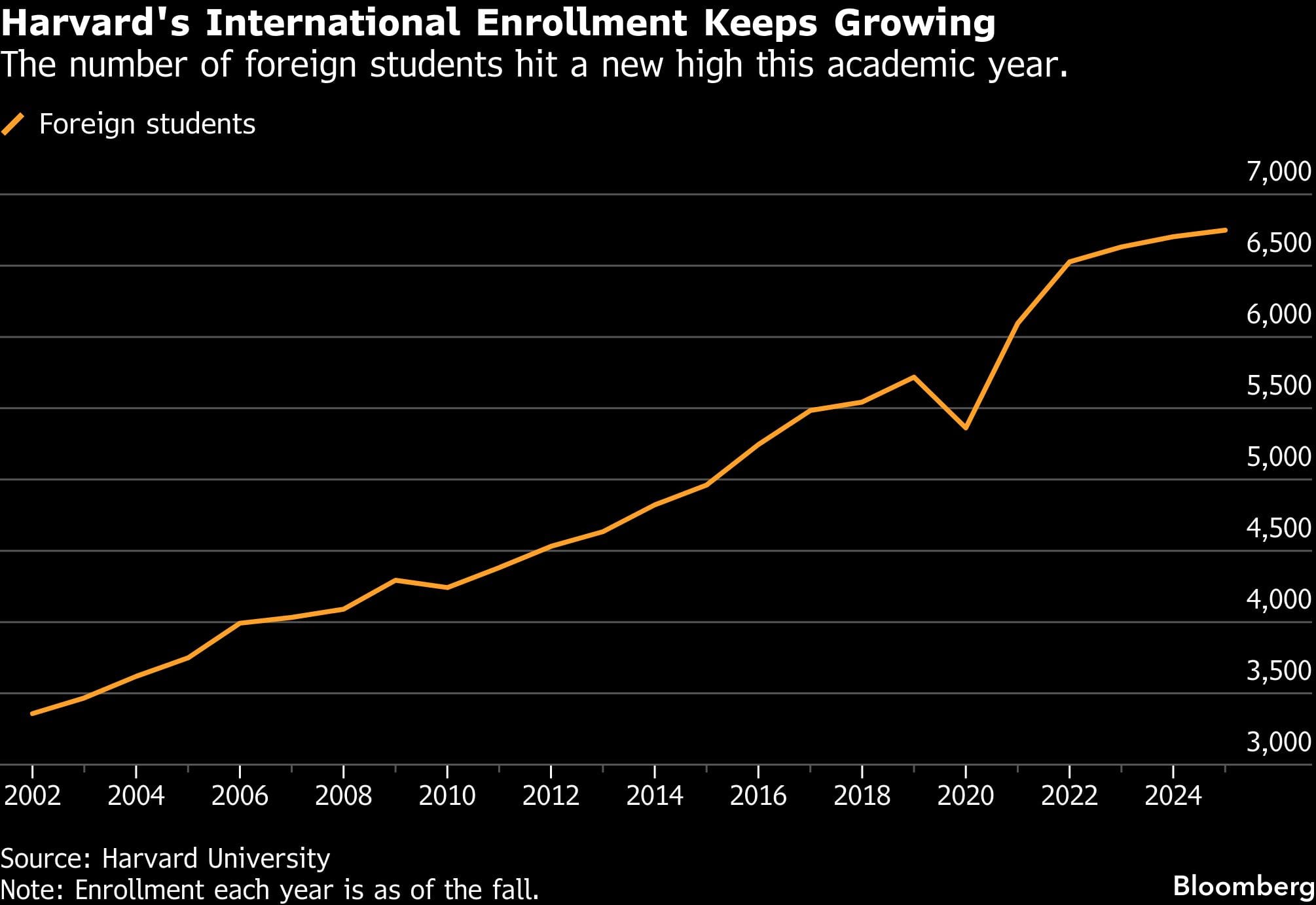The share of foreign students enrolled at Harvard in the fall of 2025 rose slightly to 28%, or 6,749 students, according to data published Friday by the university. That’s the most since at least 2002, according to Harvard data.