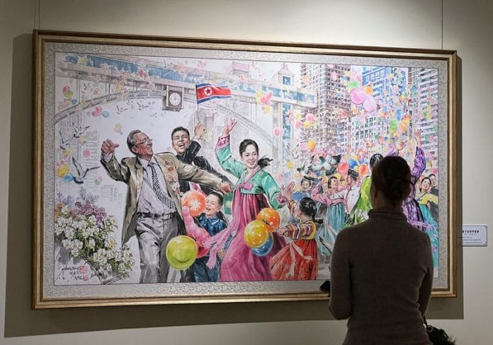 A giant photograph of Putin and North Korea’s Kim Jong Un shaking hands looms large at the start of the exhibition – “Art Exhibition DPRK. A country of Great People,” which occupies part of Russia’s Museum of Decorative Arts in central Moscow.