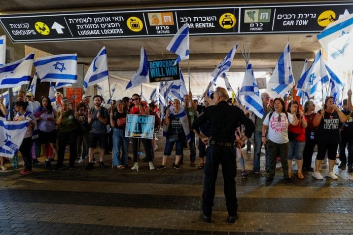 BEN GURION AIRPORT, Israel (Reuters) – Hundreds of anti-government protesters converged on Israel’s Ben Gurion Airport on Monday, with some in the crowd scuffling with police who tried to clear them from blocking access to the terminal that handles most flights in and out of the country.