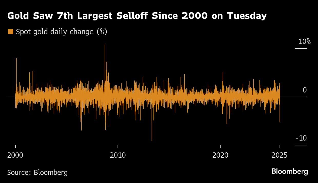 Bullion’s scorching rally came to an abrupt halt on Tuesday after a series of technical indicators signaled that too many people had bought in too short a period, elevating chances of a correction. Spot gold plunged as much as 6.3%, the most since 2013.
