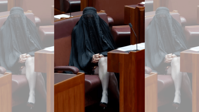 Sydney: Australian far-right Senator Pauline Hanson wore a burqa to Parliament on Monday as a political prop in her push to ban the Muslim garment in public, sparking accusations of racism from Muslim senators over the stunt.