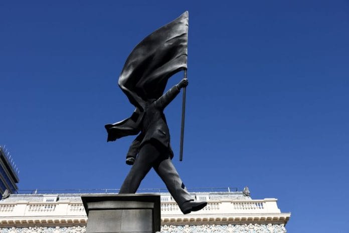 The suited figure, whose sight is obscured by the flag, has one foot poised over the edge of the plinth, indicating he is just about to step off.
