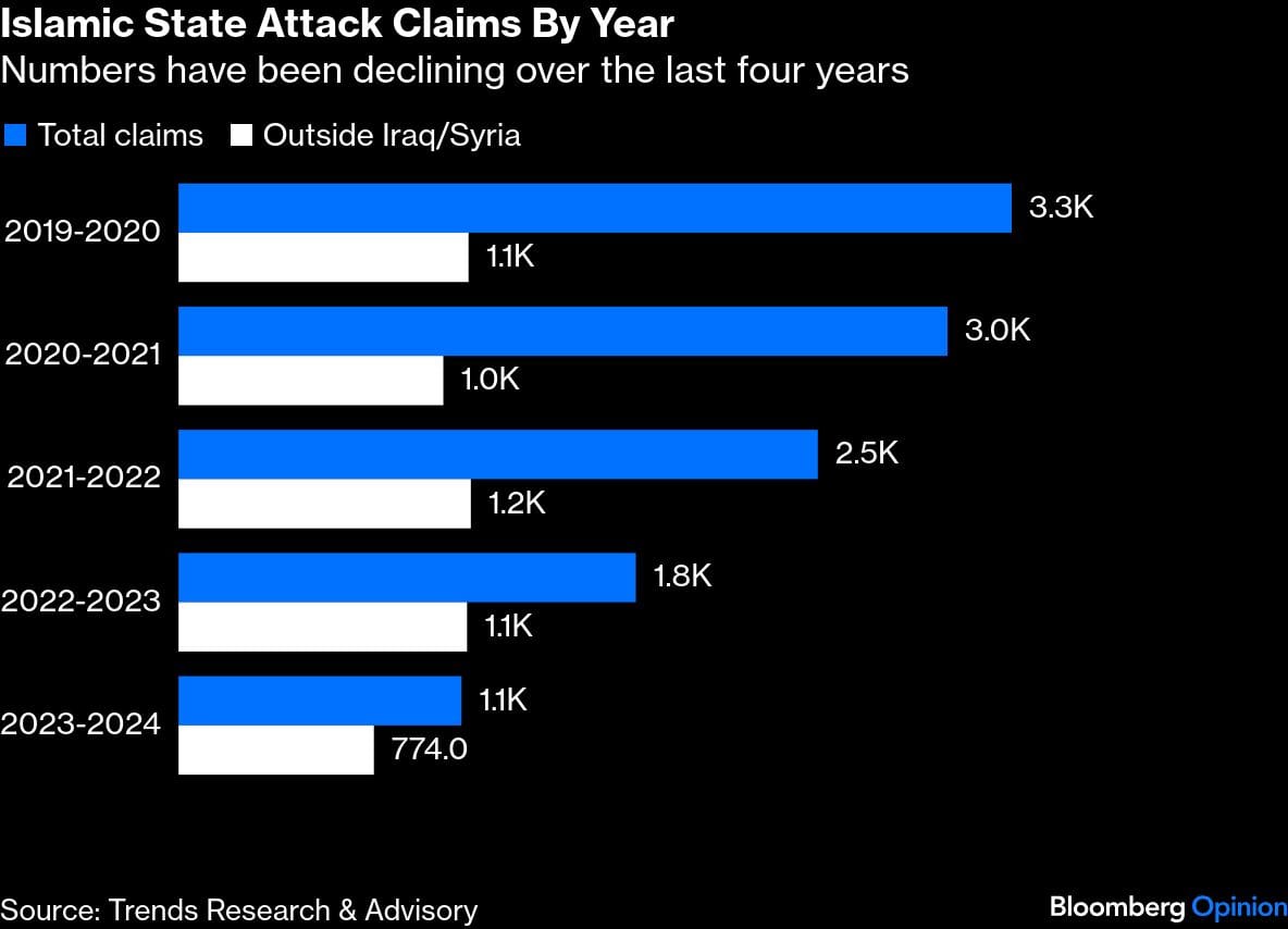 The recurring bloodshed reflects how the network has adapted, even though it has weakened considerably compared with a decade ago, when it held large swathes of territory in Iraq and Syria. Islamic State remains the deadliest terrorist movement in the world, notes Sydney-based think tank Lowy Institute, because its ideology continues to motivate plotters long after the defeat of its so-called caliphate. Today, its power lies in propaganda, much of it circulating online.