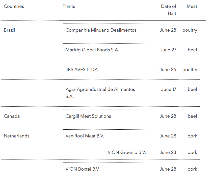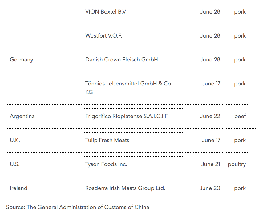 Customs authorities suspended imports from plants in countries including Brazil, Canada and Germany, according to a notice on a departmental website. While China didn’t provide a reason for the suspension, most, if not all, of the facilities had one thing in common: Covid-19 outbreaks.