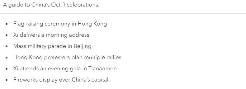 The Oct. 1 National Day events in Beijing include a speech from Xi, as well as a military parade past Tiananmen Square expected to show off China’s most advanced weaponry, including ballistic missiles and warplanes. In Hong Kong, where protests have rocked the financial hub for 17 straight weekends, residents braced for numerous protests to push back against China’s tightening grip over the city.