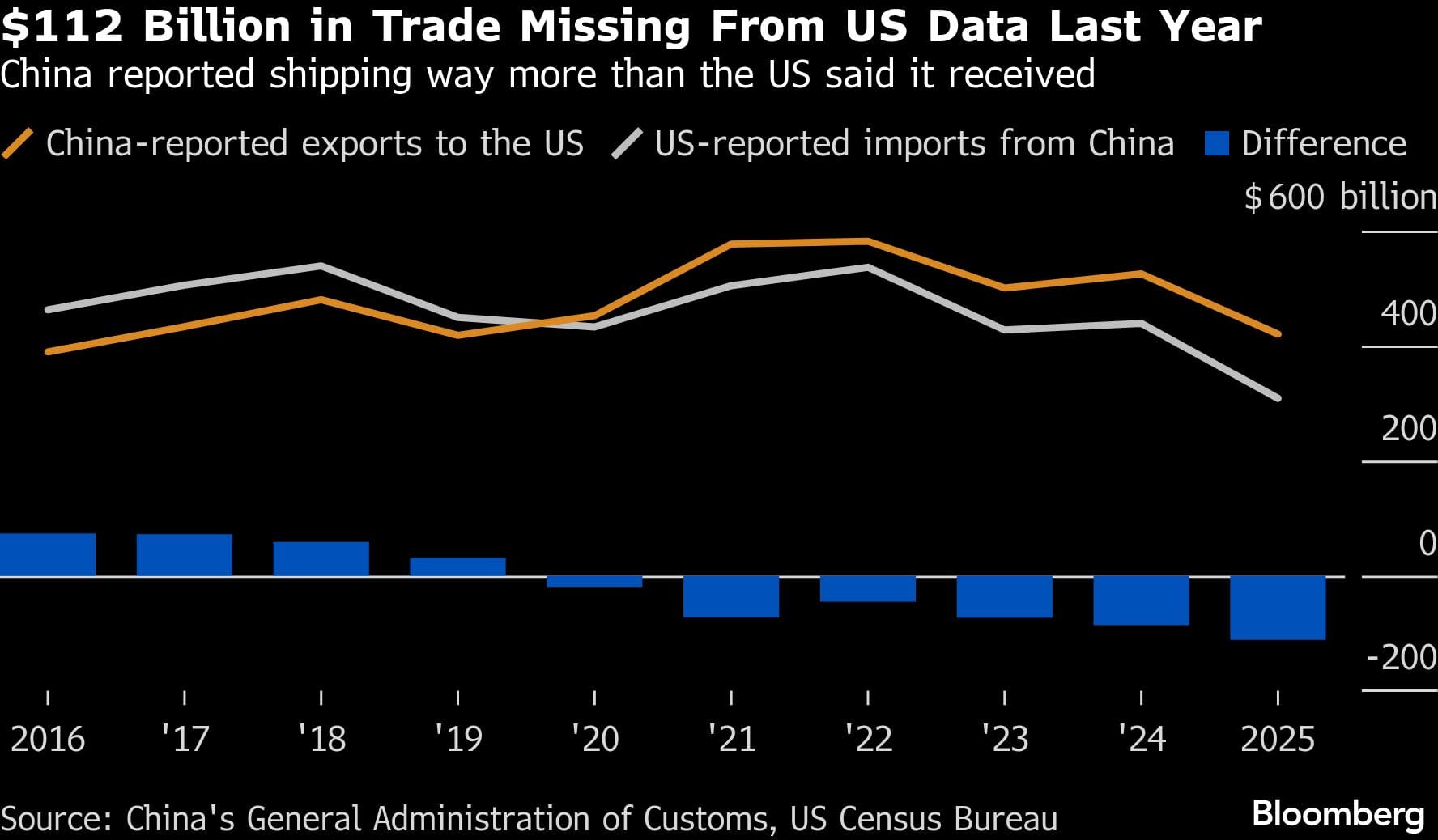 The scale of the problem is staggering. Trade data released Thursday showed a record $112 billion gap between what China reported exporting to the US and what US Customs said actually arrived last year. Put simply, that suggests as much as a quarter of what Asia’s top economy shipped to American shores last year slipped under the tariff radar.