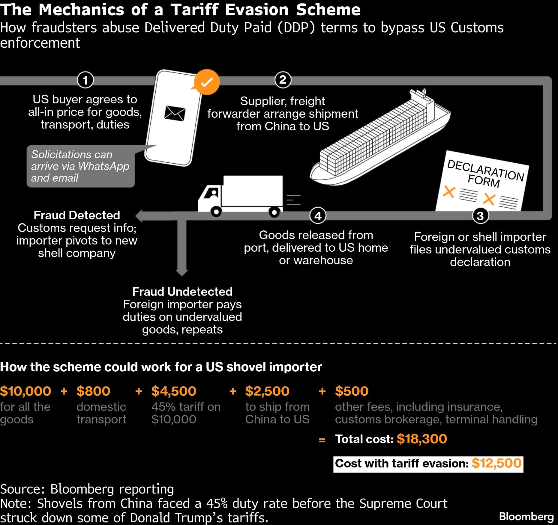 Kersey is among a dozen business owners, shipping merchants, trade attorneys and former customs officials who spoke to Bloomberg News sounding the alarm over apparent tariff fraud surging to record proportions. Fueled by aggressive Chinese logistics tactics and the highest duties in a century, the suspected evasion is blunting Trump’s trade agenda while penalizing compliant companies.