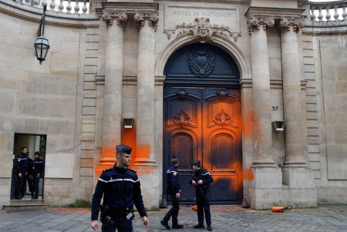 PARIS (Reuters) – Two climate activists spray-painted the front entrance of the French prime minister’s office on Wednesday in protest at what campaign group Derniere Renovation (Last Renovation) called “climate crimes” committed by the state.