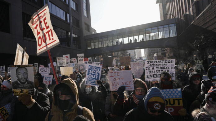Minneapolis: Thousands of demonstrators braved bitter cold to march through the streets of Minneapolis on Friday anddemand an end to President Donald Trump’s immigration crackdown in their city, part of a wider “ICE OUT!” show of defiance that organizers billed as a general strike.