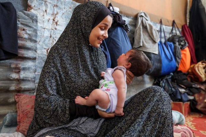 DEIR AL-BALAH, Gaza (Reuters) – Gazan mother Rana Salah cradles her one-month-old daughter Milana in her arms in a sweltering tent for the displaced, and speaks of the guilt she feels for bringing her child into a world of war and suffering.